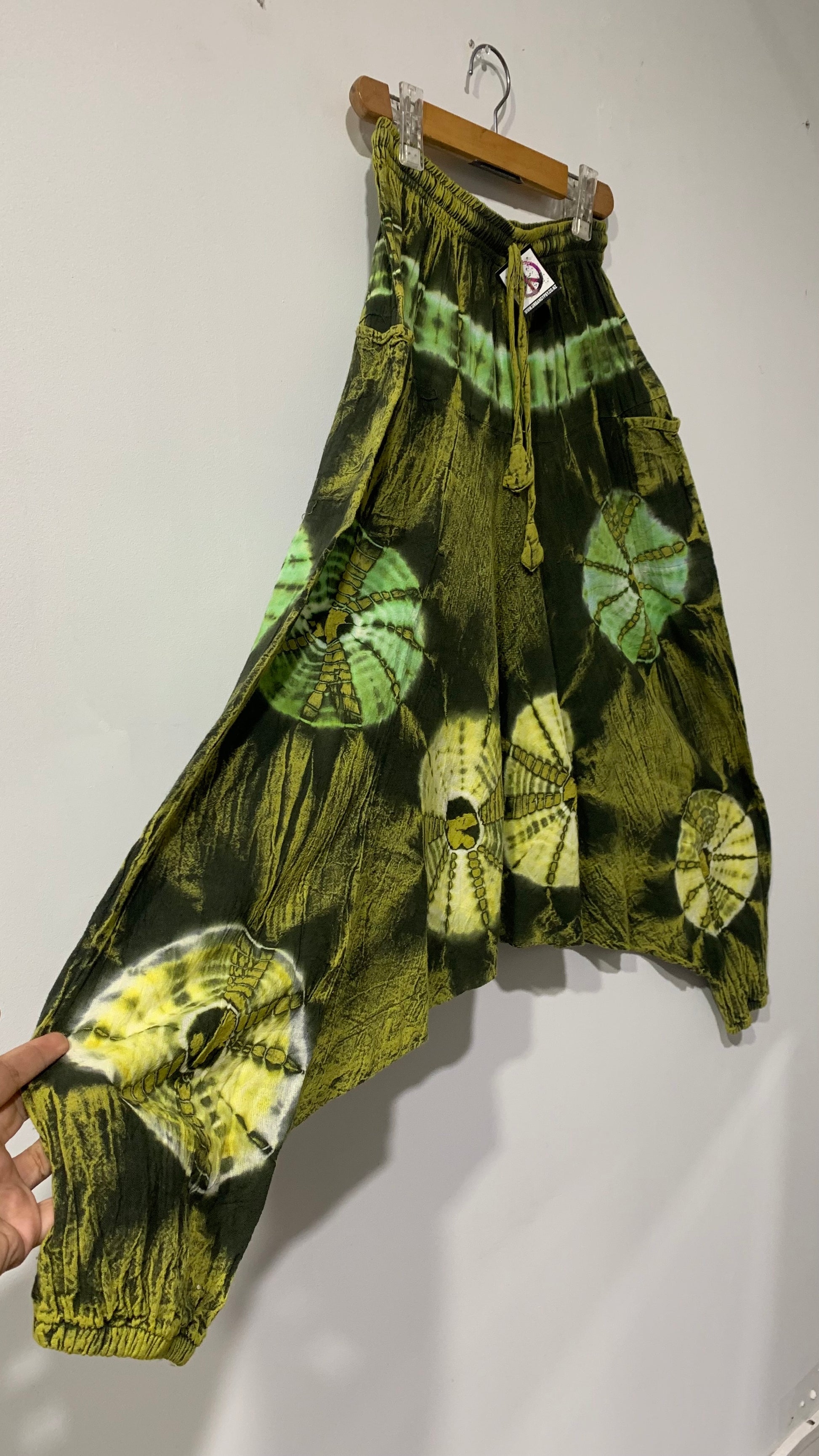 Boho Handcrafted tie dye Drop Crotch pants made from cotton. They have an elasticated waistband and elasticated ankles .