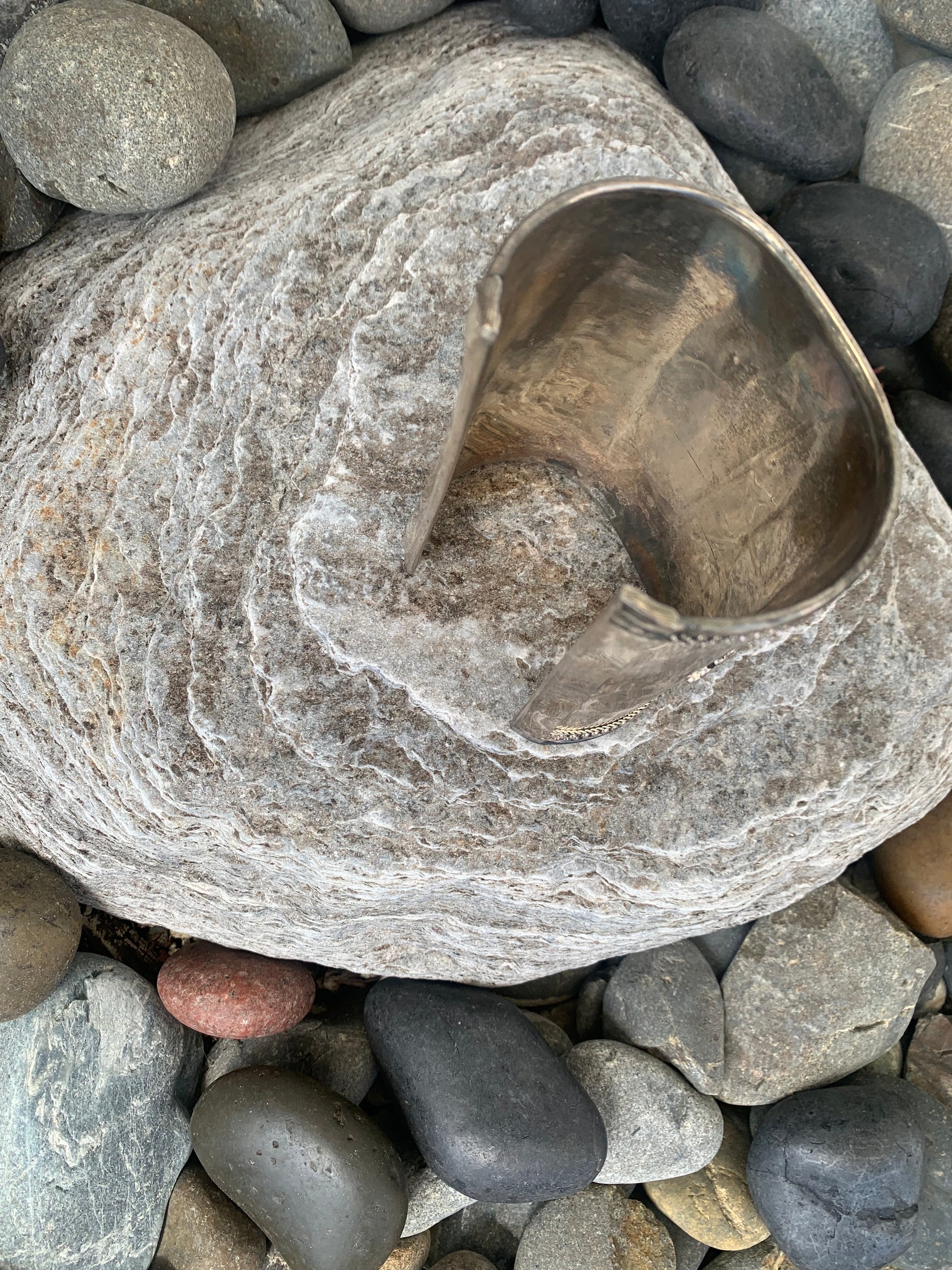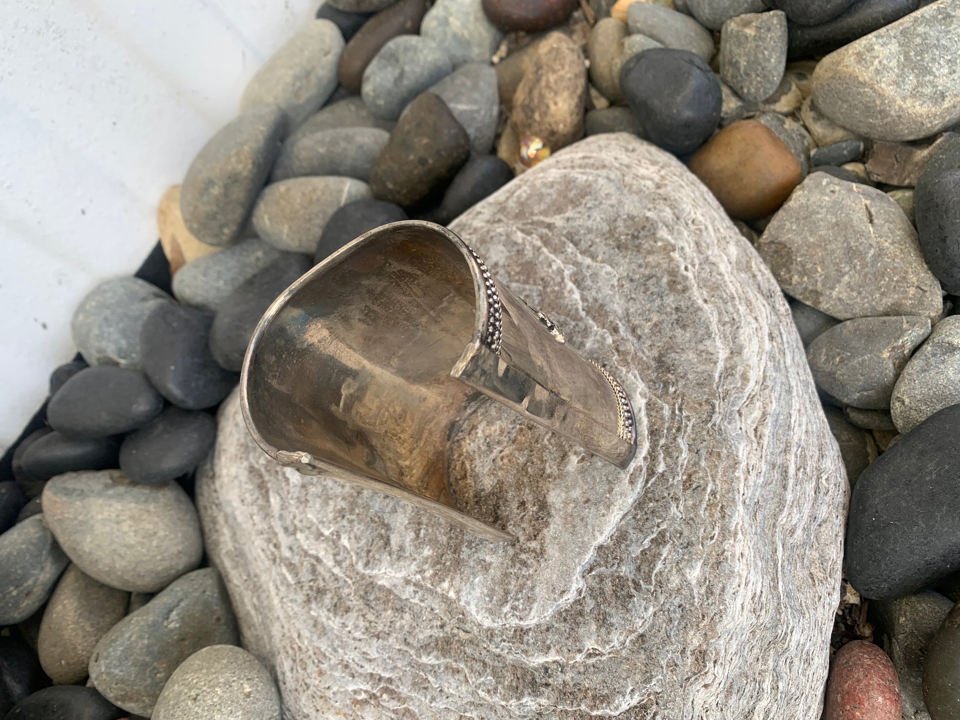 Expertly handcrafted, this BOHO-style cuff bracelet is the perfect statement piece have stones on them . With a domed design and adjustable sizing, it offers both elegance and versatility. The oxidized finish adds a unique touch and can be easily customized to fit your wrist with a simple application of slight pressure.