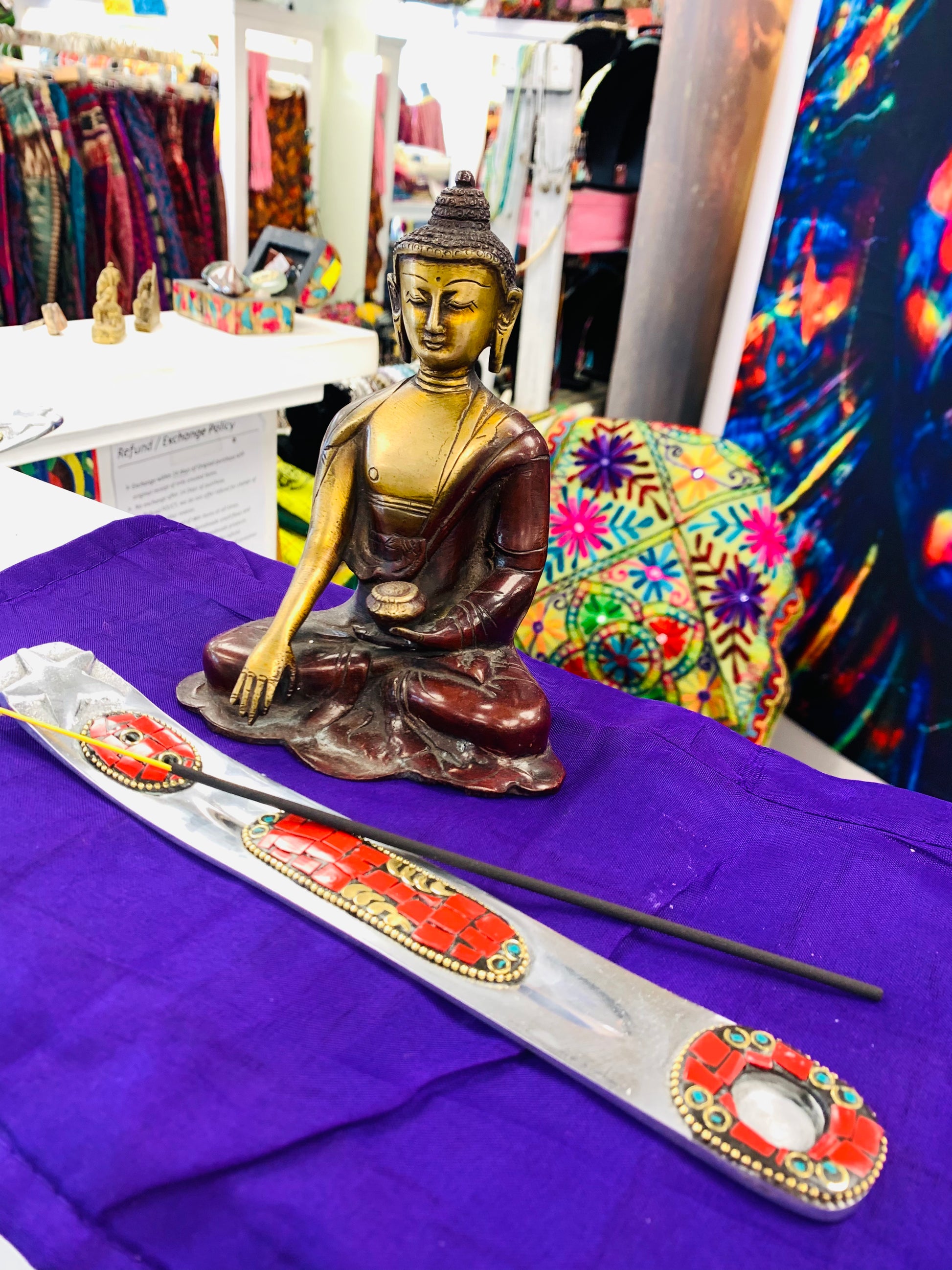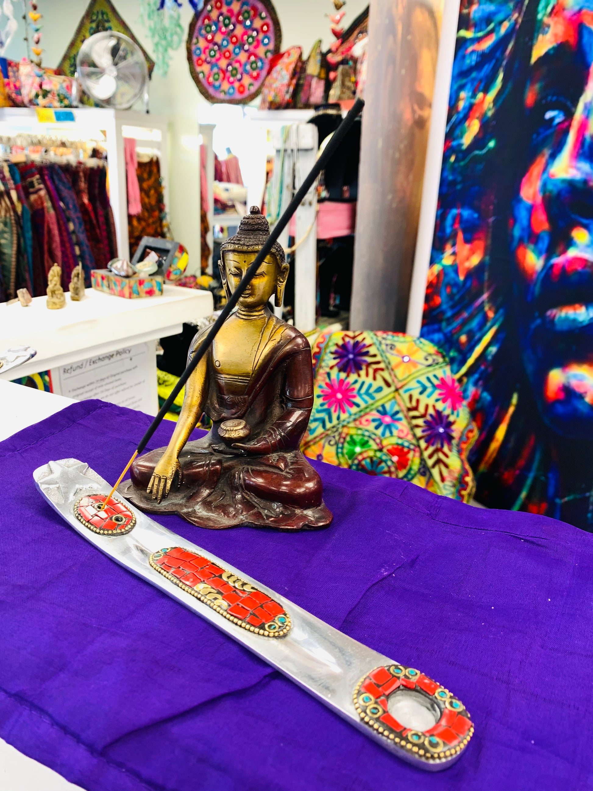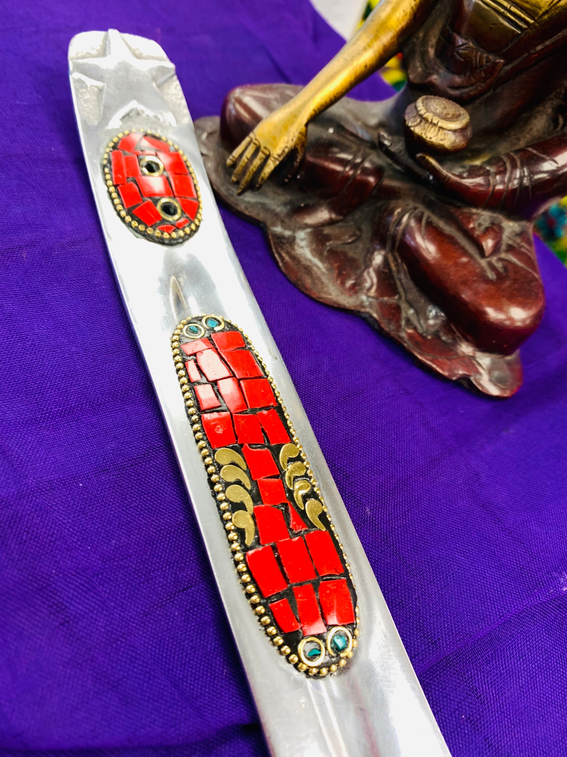Bohemian style handcrafted and hand carved , metal Incense holder/ burner, ash catcher, tibetan style. For incense sticks/cones or candles.