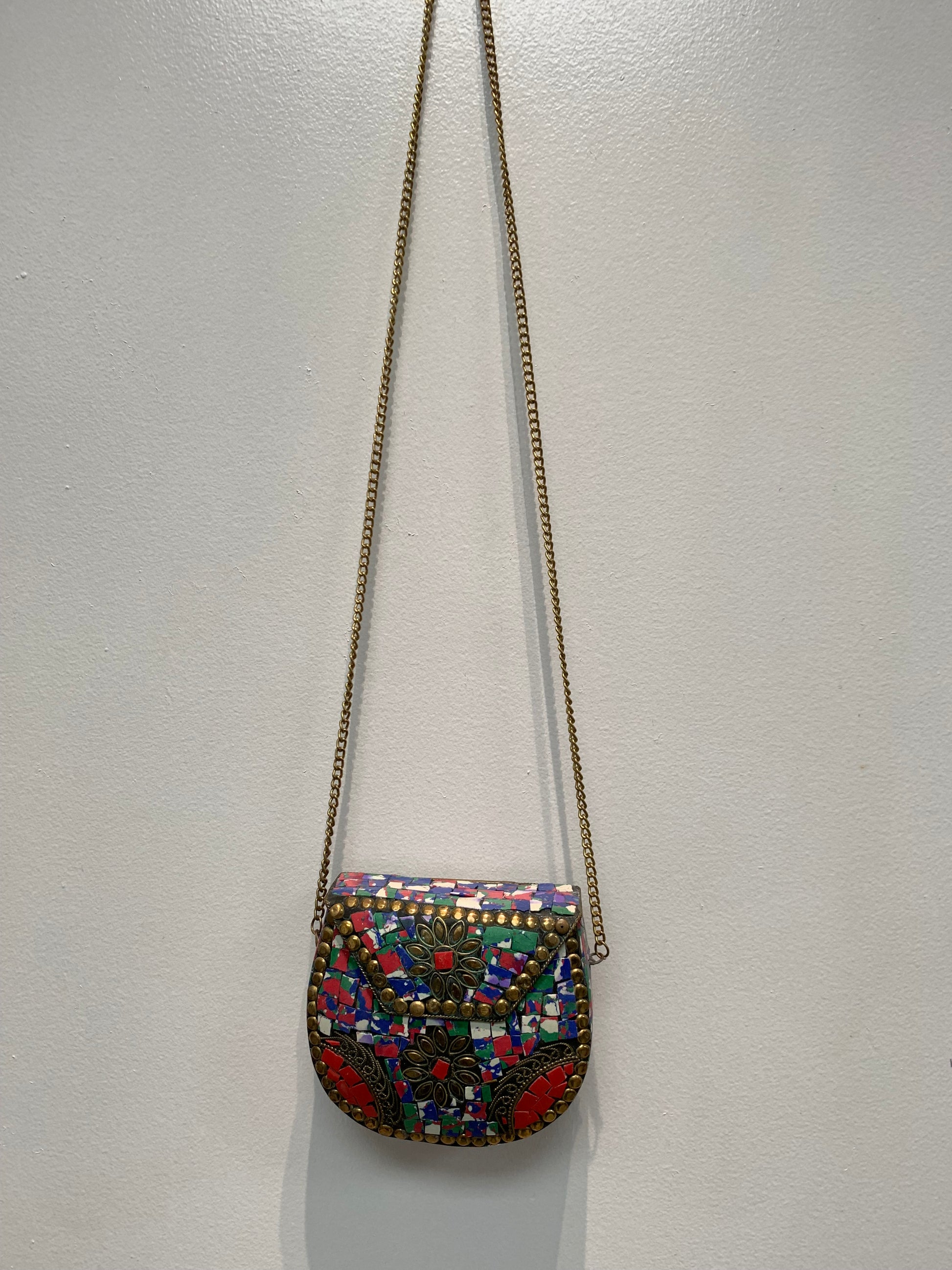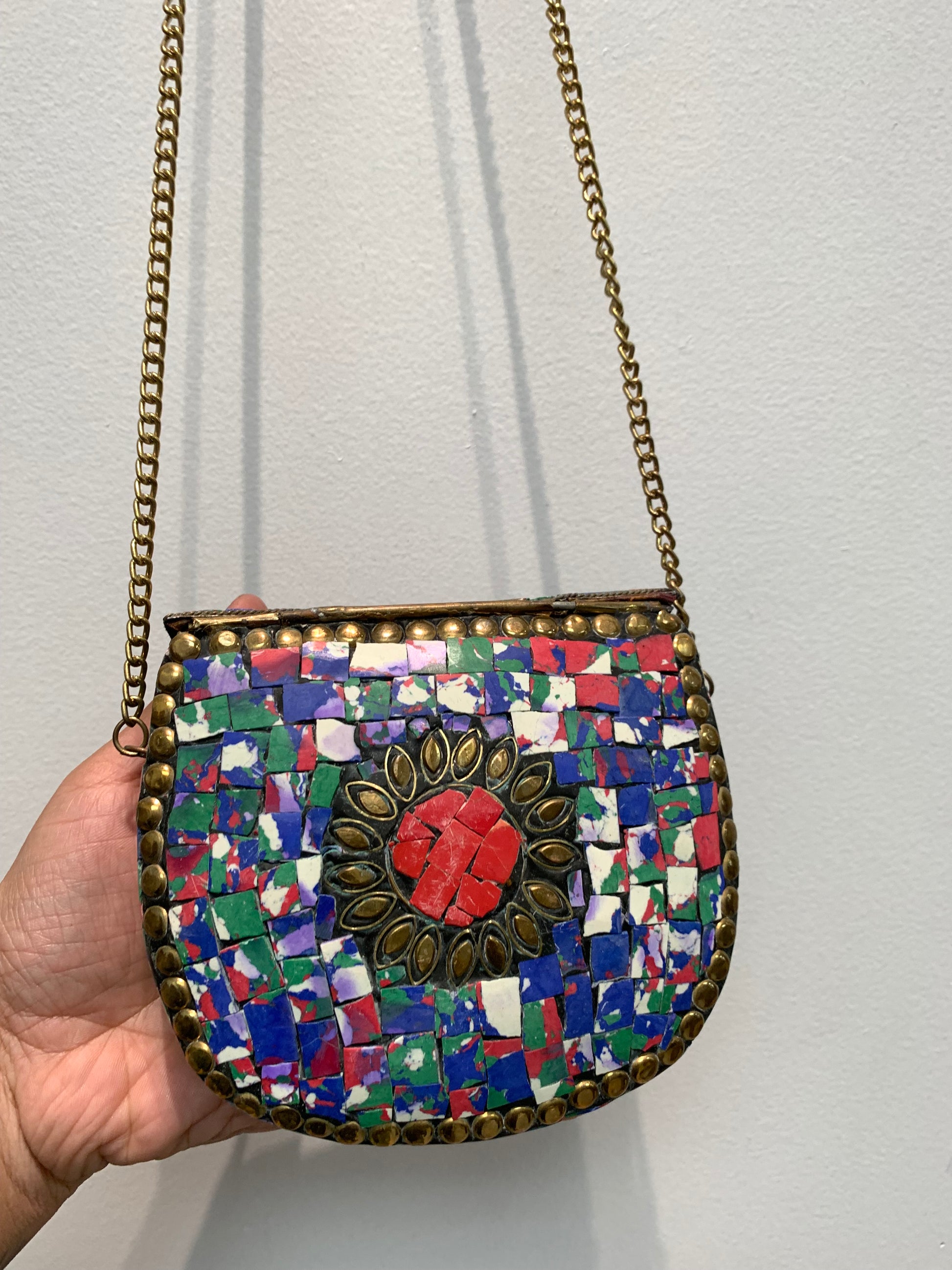 Bohemian style handcrafted and Hand carved Brass / Metal Clutch with natural stones inlaid .