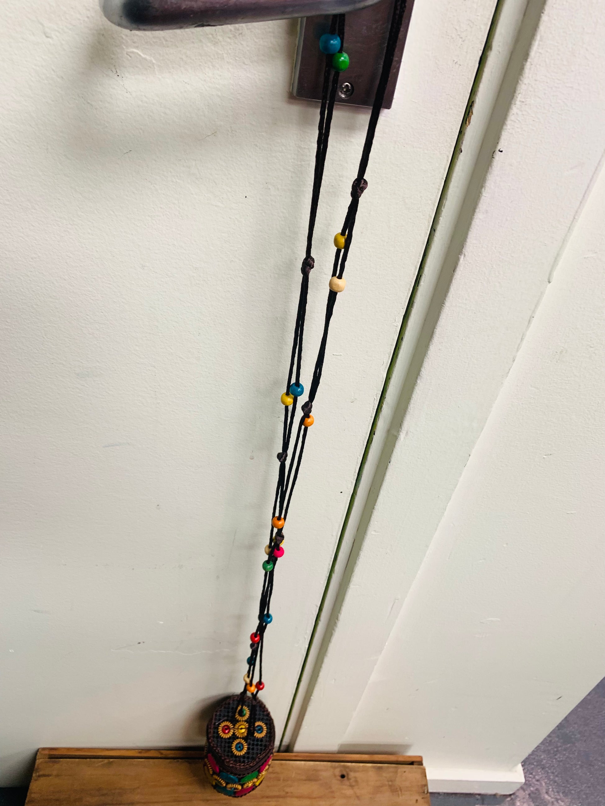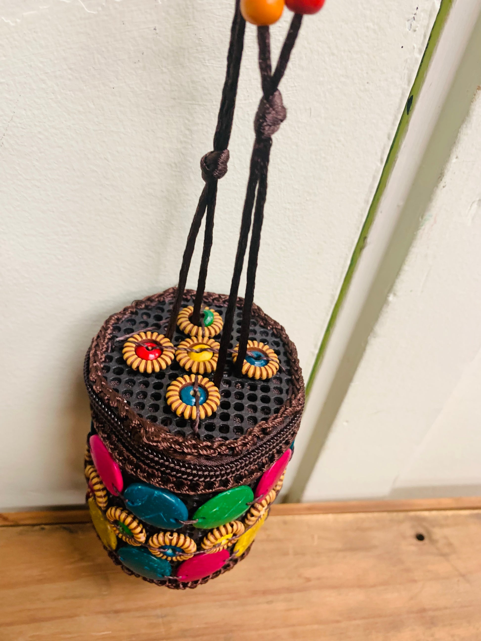 Bohemian handcrafted Wooden Buttons with crotchet Macrame small coin Round shaped pouch with coloured wood beads on string .