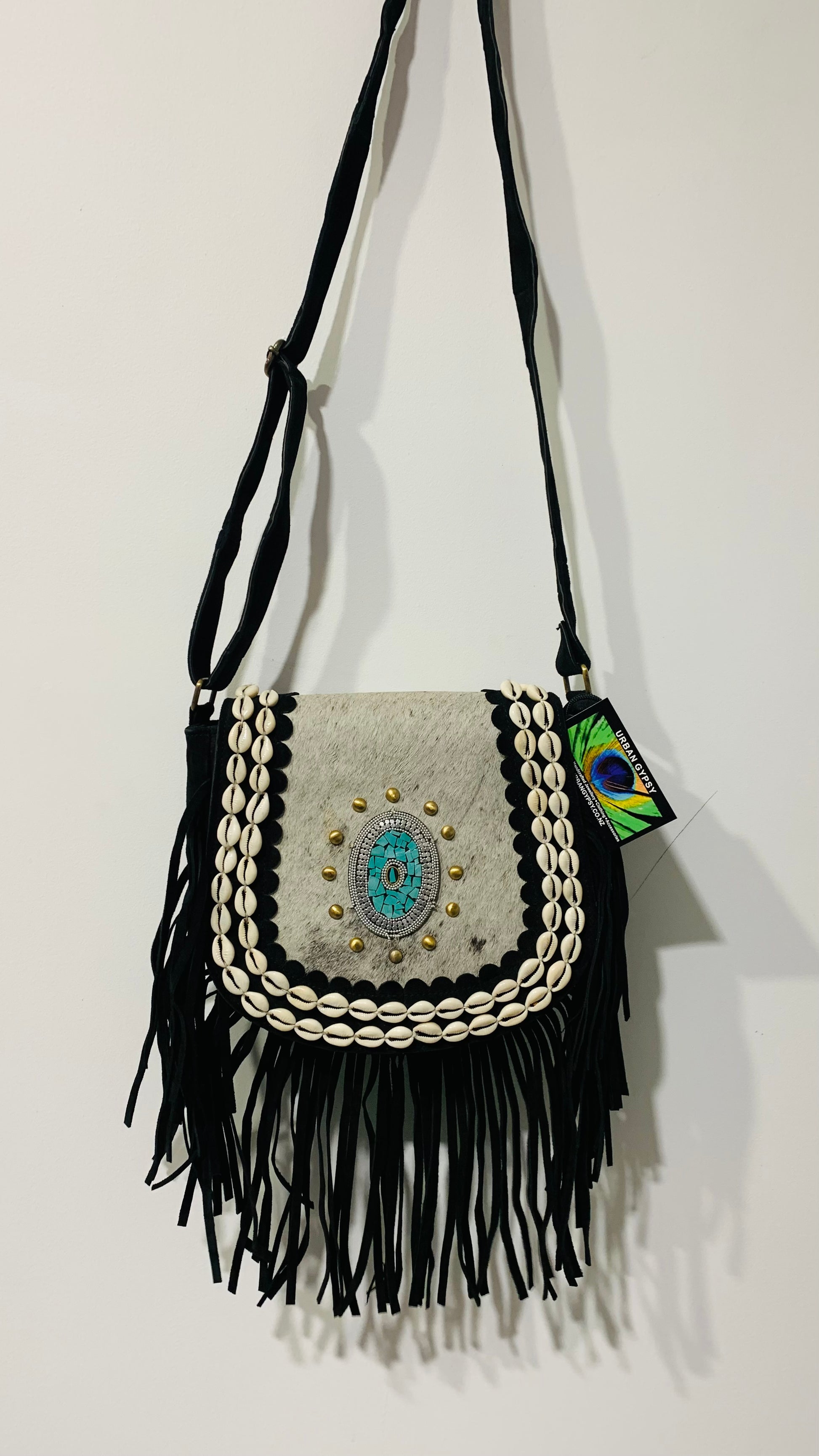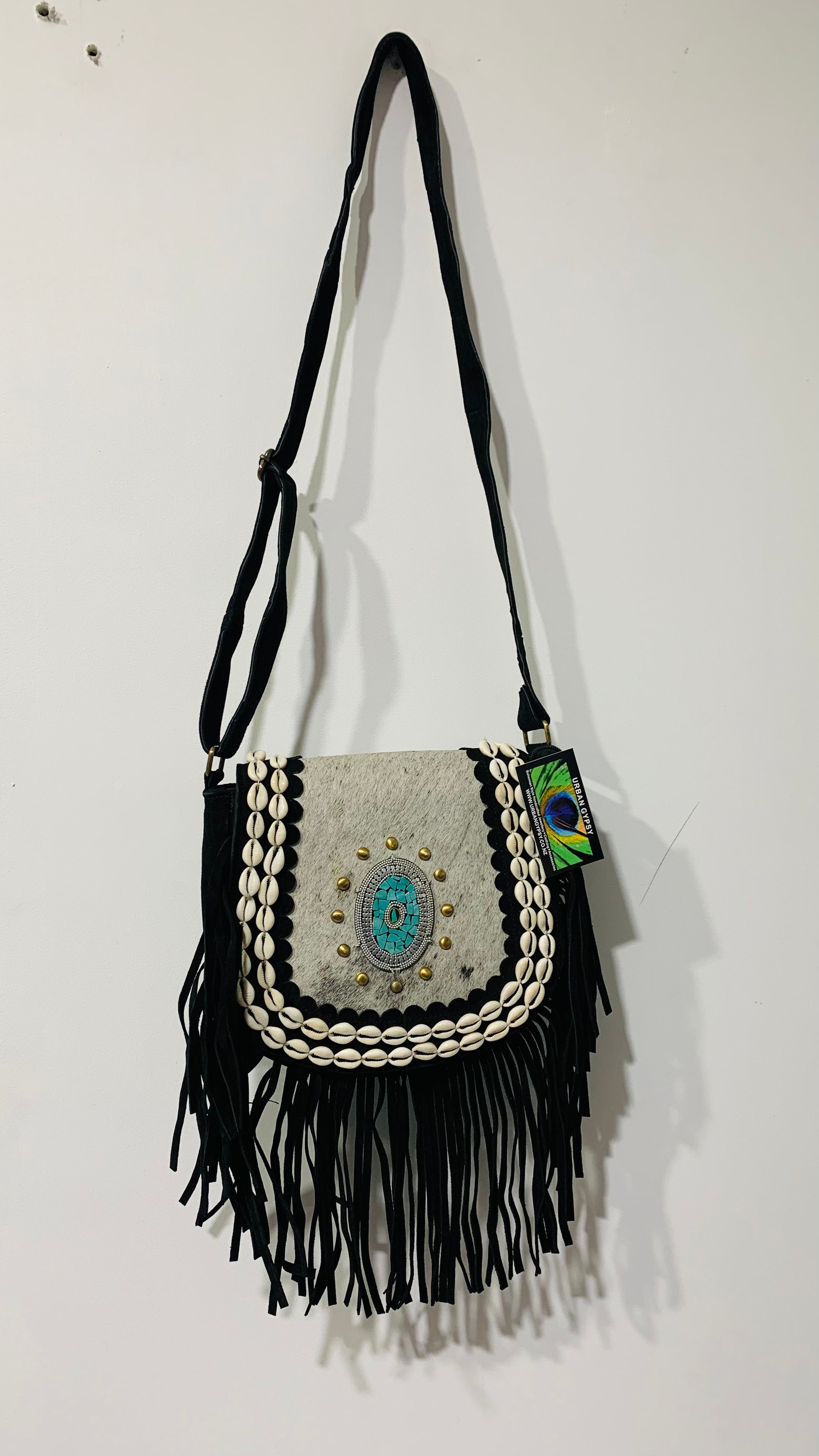 Boho Handcrafted Genuine Suede leather and Natural Cowhide Shoulder bag with Tassels and cowrie shells.