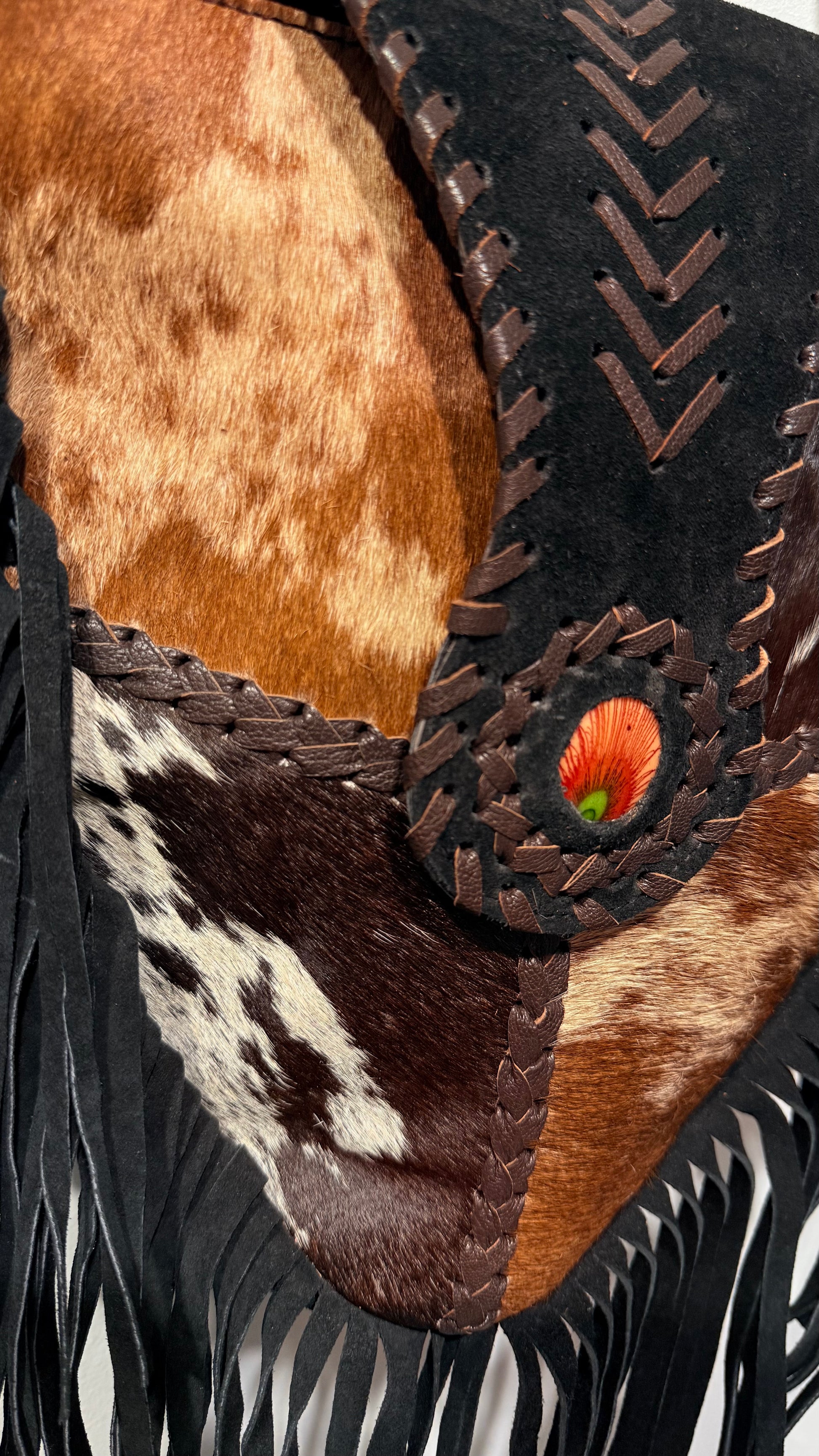 Boho Handcrafted Cowgirl Country Genuine Suede Leather Bag with Natural Cow fur features a zipper closure and multiple pockets for secure storage. The shoulder strap is adjustable and the magnetic button closure adds extra security to the spacious main compartment.