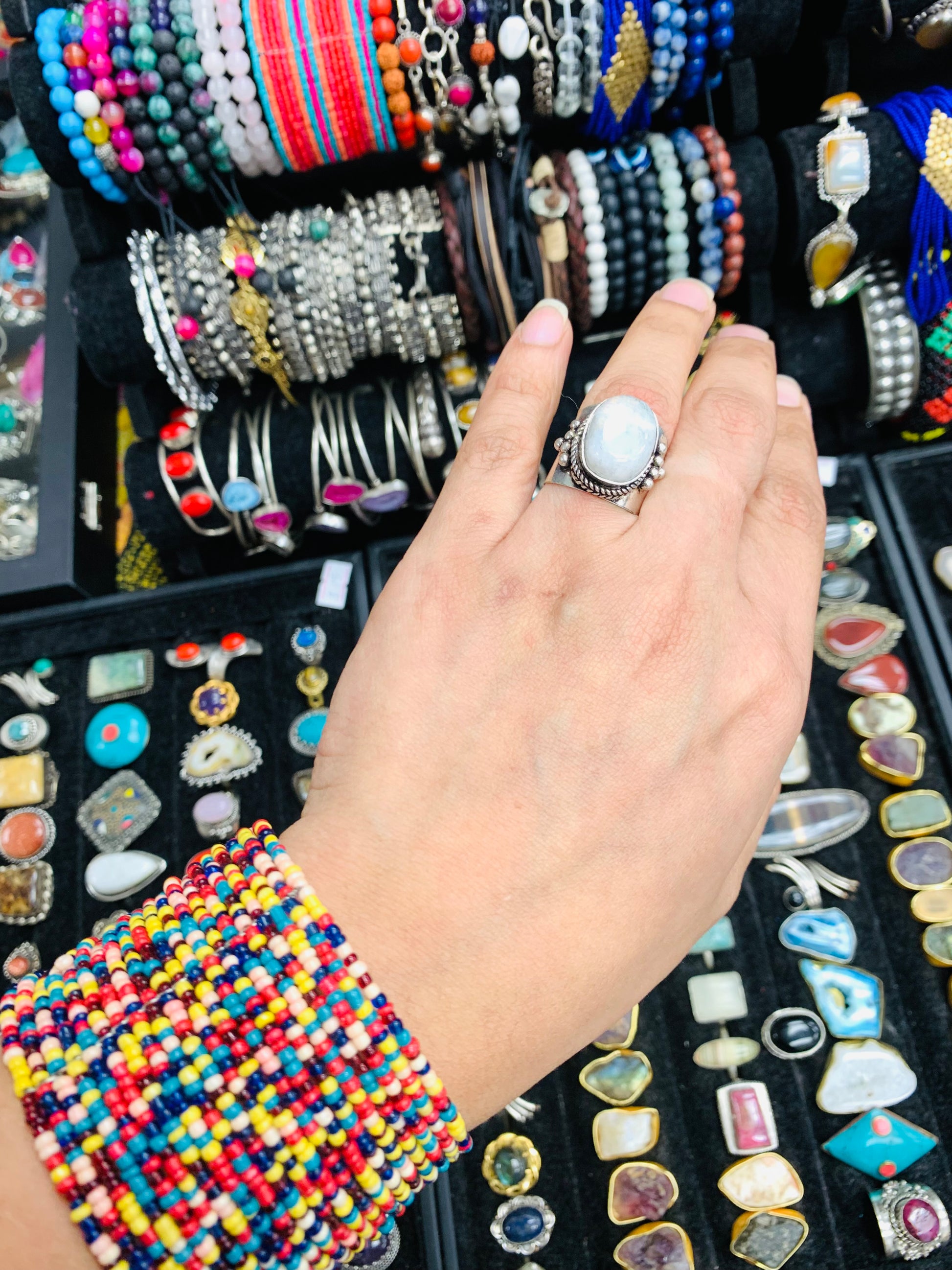 Boho natural stone in solid metal frame Ring .
